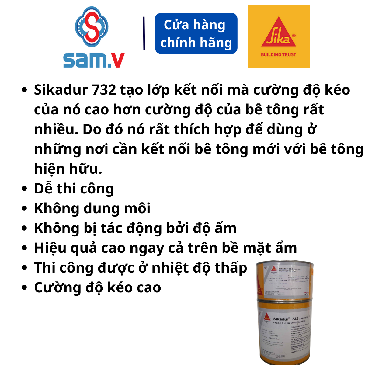 - + Kết dính tuyệt hảo với bê tông và nhiều vật liệu khác