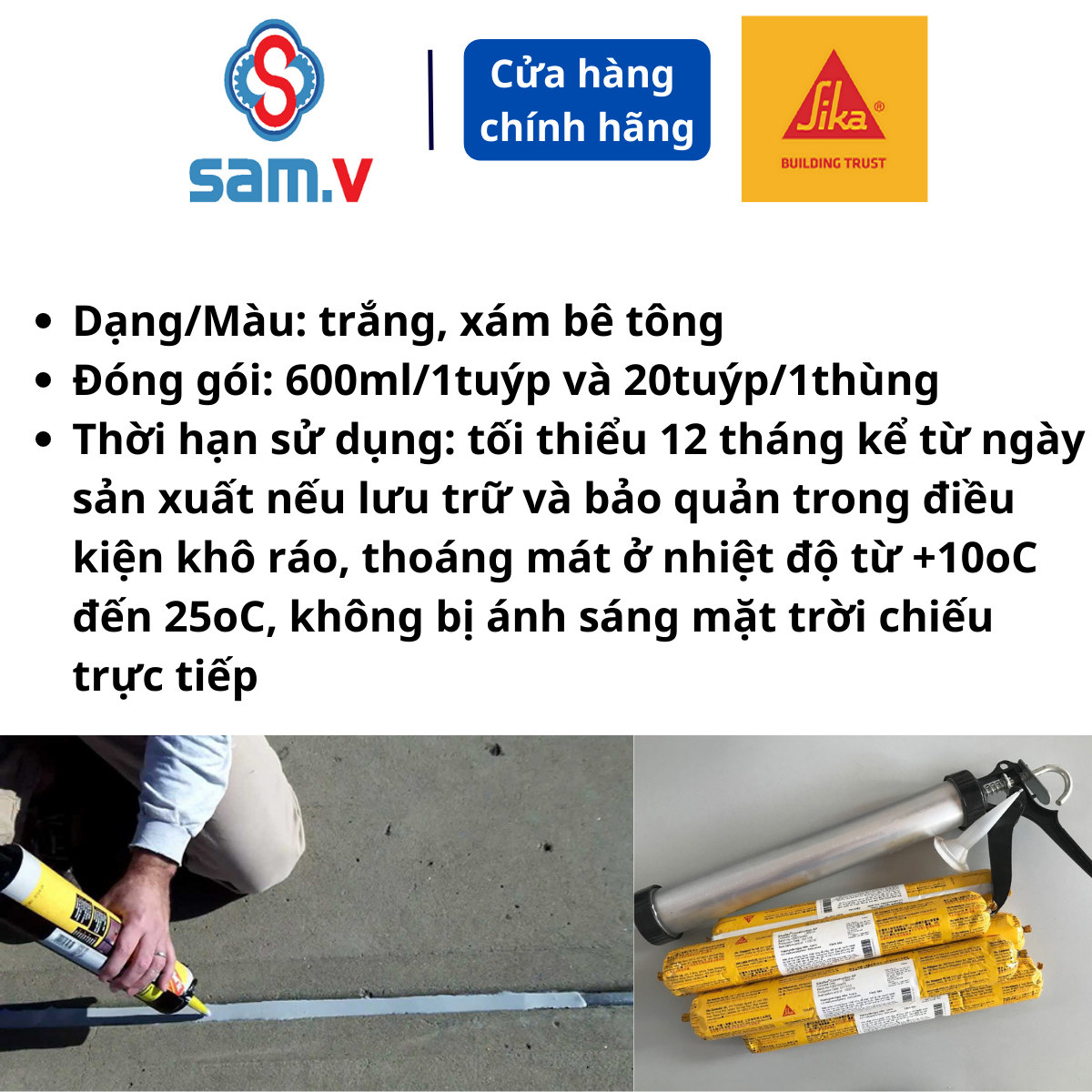 - Dạng/Màu: trắng, xám bê tông